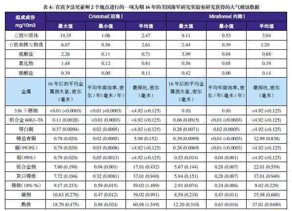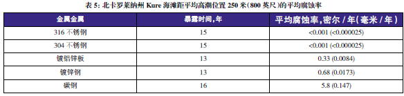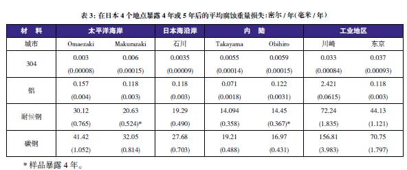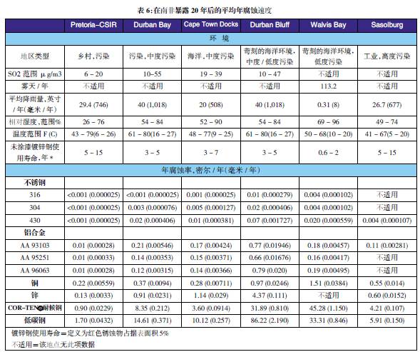 表3至表6的數(shù)據(jù)來自于日本、巴拿馬、Kure 海灘(北卡萊羅納州)和南非的試驗地點。可利用這些數(shù)據(jù)在類似環(huán)境中選擇適當?shù)慕饘俨牧希M行生命周期成本分析。