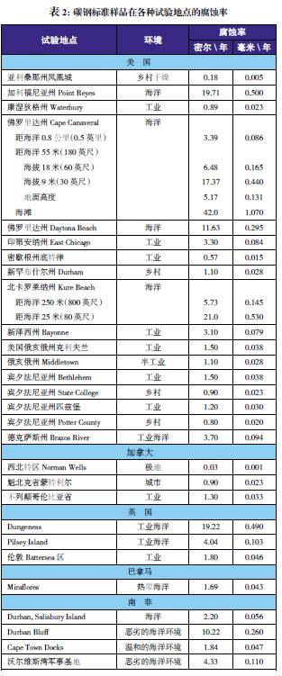 世界各地都進行過各種應用環(huán)境下的金屬腐蝕性能比較試驗。以碳鋼為標準樣品對這些試驗地點的腐蝕性進行了比較。表2給出了標準樣品在北美試驗地點的腐蝕率數(shù)據(jù)。盡管某些地點處于經(jīng)常使用除冰鹽的地區(qū),但樣品并未暴露于除冰鹽之下。